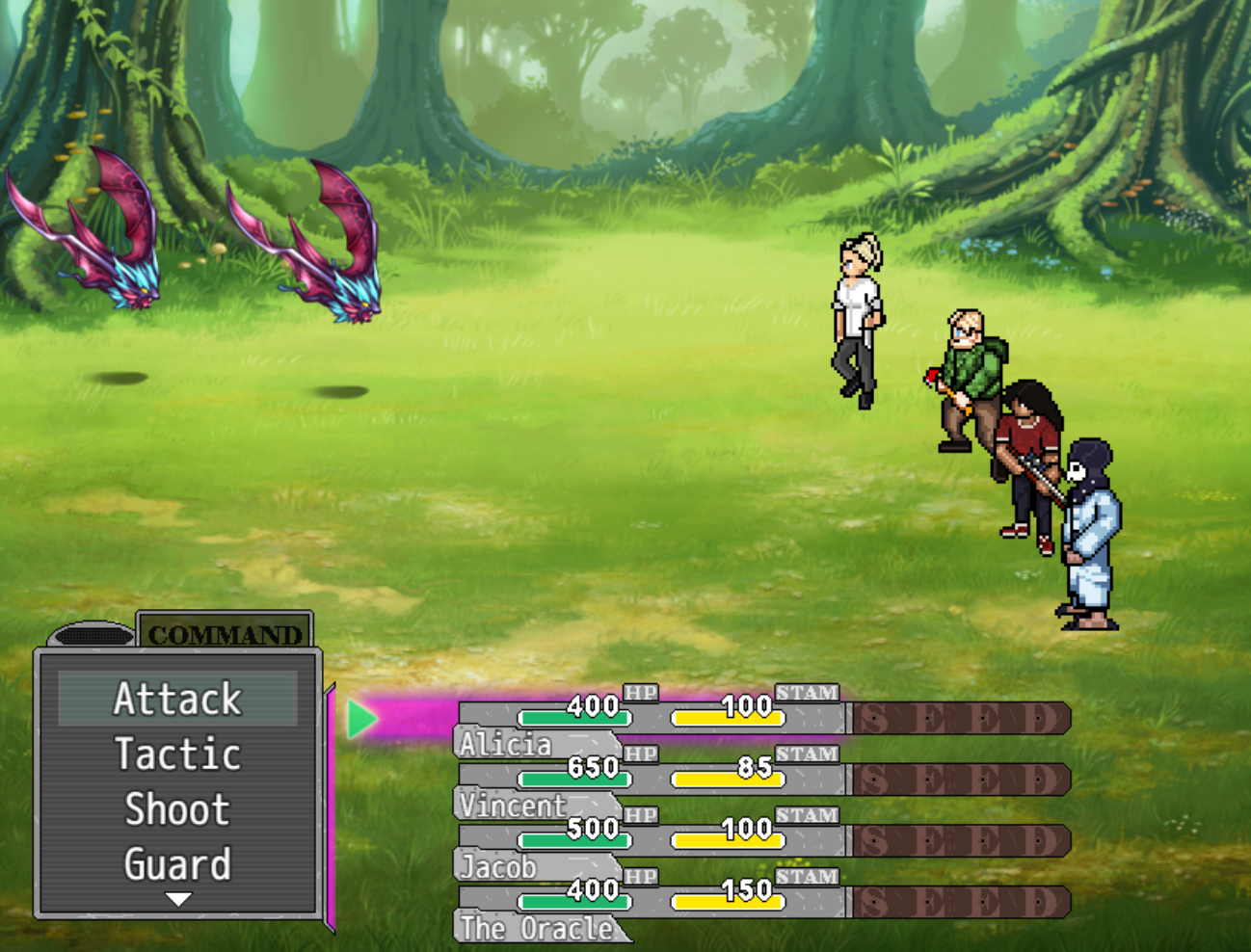 The game takes heavy inspiration from Final Fantasy Dimensions where the player controls two separate parties going through two different worlds. My game has the player half in a Fantasy setting and half in an Post Nuclear Apocalypse setting.